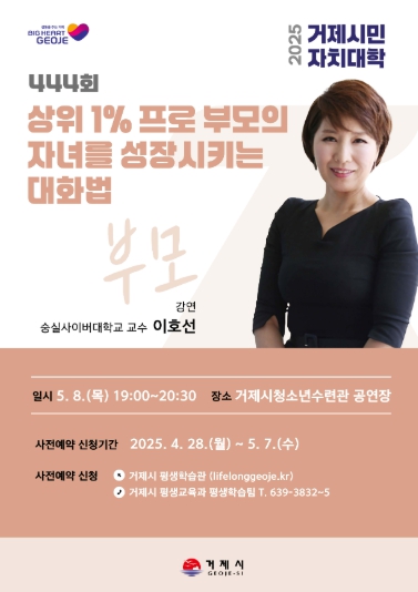 [무한뉴스=최진수 기자] 거제시가 5월 8일 거제시청소년수련관에서 숭실사이버대학교 이호선 교수를 초청해 ‘제444회 거제시민자치대학’을 개최한다고 밝혔다.