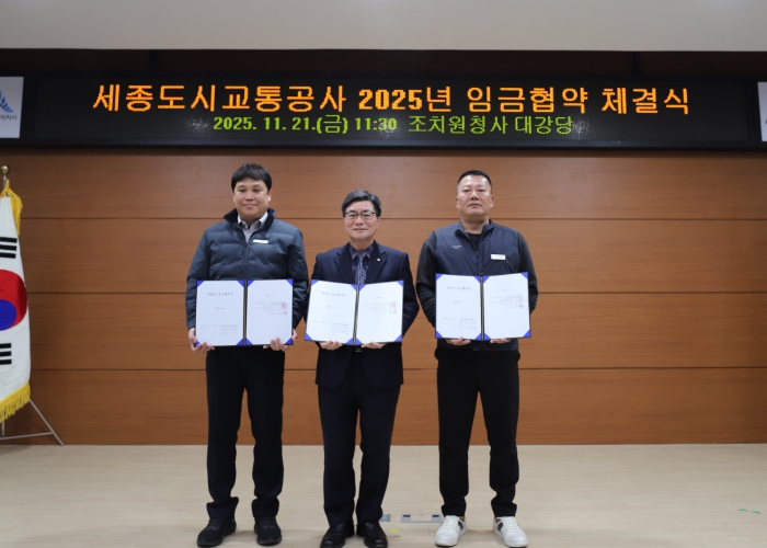 [무한뉴스=정민정 기자] 세종도시교통공사는 11월 21일 조치원본사 3층 대강당에서 교섭대표노동조합(전국지방공기업노동조합연맹 세종도시교통공사 공기업노동조합, 세종도시교통공사 노동조합)과 2025년 임금협약을 체결했다고 밝혔다.