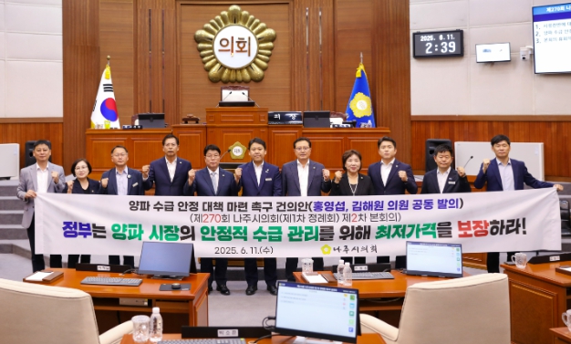 나주시의회는 건의안을 통해 ▲양파 시장의 안정적 수급 관리를 위해 최저가격을 보장할 것과 ▲농가의 생존권을 위하여 실효성 있는 양파 수급 안정 대책을 조속히 마련할 것을 강력히 촉구했다.