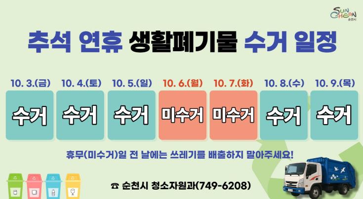 추석 연휴 기간 동안 종량제 및 재활용, 음식물쓰레기 등 생활폐기물 수거는 10월 3일 금요일부터 10월 5일 일요일까지 정상적으로 이뤄지며, 추석 당일인 10월 6일 월요일과 10월 7일 화요일까지 이틀간은 수거하지 않는다.