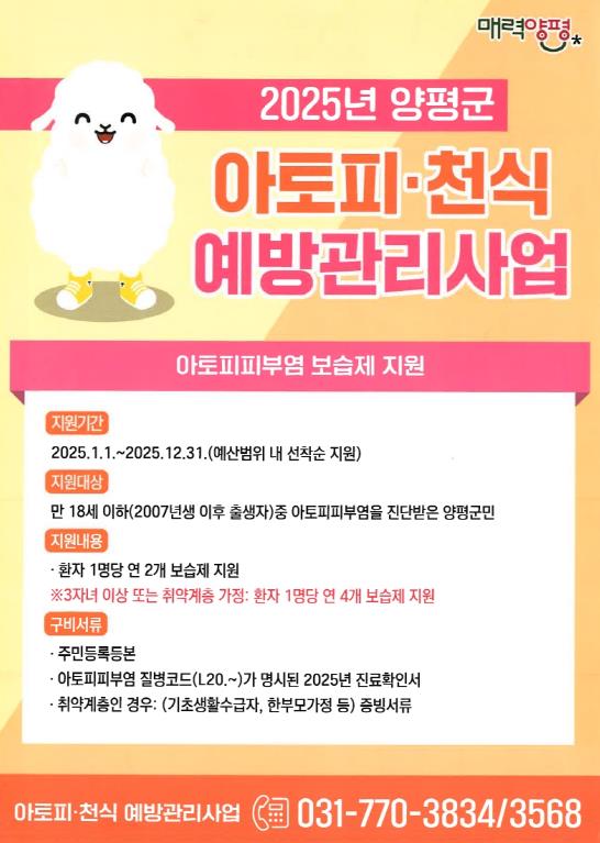 [무한뉴스=정승훈 기자] 양평군은 지역사회 중심의 알레르기질환 조기 발견과 적절한 치료를 위해 2025년 연중 ‘아토피 피부염 보습제 지원’과 ‘취약계층 알레르기질환 의료비 지원’을 실시한다고 밝혔다.