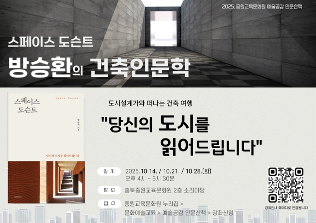 [무한뉴스=정승훈 기자] 충청북도교육청 직속기관 중원교육문화원(원장 배상근)은 교육공동체 구성원들의 인문적 소양과 예술적 감수성을 높이기 위해 운영중인 문화교육 프로그램 '예술공감 인문산책'의 10월 강연 수강생을 선착순 모집한다고 전했다.