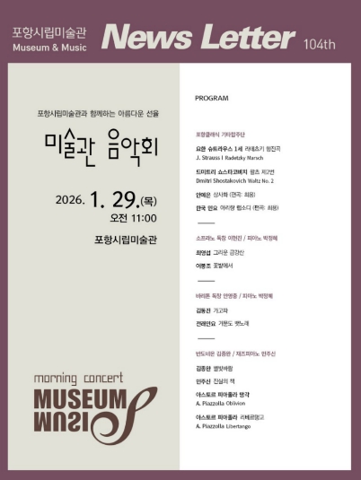 포항시립미술관 관계자는 “제104회 미술관 음악회는 2026년 새해를 시작하는 뜻깊은 무대로, 지역 예술단체와 전문 연주자들이 함께 만들어가는 문화 화합의 장”이라며, “신년을 맞아 가족, 친구, 이웃과 함께 미술관에서 새해의 활력을 얻는 시간이 되길 바란다”고 전했다.