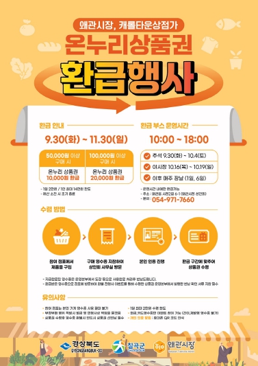 [무한뉴스=최진수 기자] 칠곡군은 전통시장 활성화와 지역경제 활력 제고를 위해 9월 30일(화)부터 11월 30일(일)까지 전통시장 구매 고객을 대상으로 온누리상품권 환급행사를 진행한다.