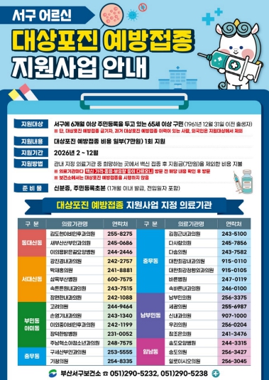 [무한뉴스=최진수 기자] 부산 서구는 올해 65세 이상 어르신들을 대상으로 대상포진을 예방하고 노년기 삶의 질 향상을 도모하고자 대상포진 예방접종 지원사업을 오는 2월부터 서구 관내에 첫 도입한다.