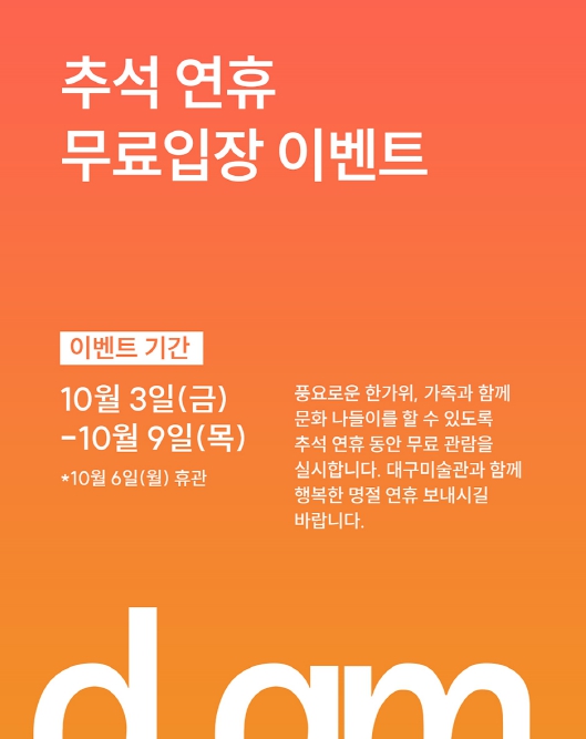 [무한뉴스=최진수 기자] 대구문화예술진흥원대구미술관은 추석 당일인 10월 6일 휴관하고, 연휴 기간인 3일부터 9일까지 무료 개관해 시민들의 명절 문화생활을 함께 한다.