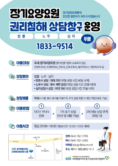 [무한뉴스=정민정 기자] 제주특별자치도가 도 단위 최초로 요양보호사 등 장기요양기관 종사자를 위한 전용 상담전화 ‘시시콜콜’을 개설해 1월부터 운영하고 있다.