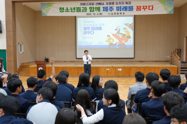 [무한뉴스=정민정 기자] 오영훈 제주특별자치도지사는 2일 남원중학교(교장 오경석)를 찾아 전교생을 대상으로 특별강연을 열고, “남원과 제주를 넘어 아시아, 나아가 우주까지 여러분의 무대가 돼야 한다”며 청소년들의 꿈과 도전을 격려했다.