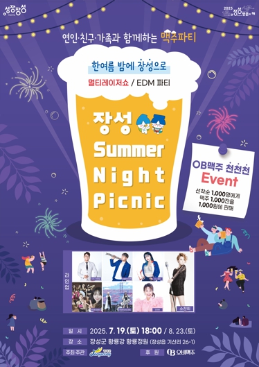 한편, ‘장성의 중심’ 황룡강도 더위에 지친 사람들을 위한 선물을 준비했다. 이달 19일 오후 6시 황룡정원 야외무대에서 ‘장성 썸머나잇 피크닉’이 열린다. 폭발적인 가창력을 지닌 가수 소찬휘를 필두로 더위에 지친 사람들에게 활력소가 될 음악을 들려준다. 선착순 1000명에게 맥주 1000잔을 1000원에 판매하는 행사도 연다.