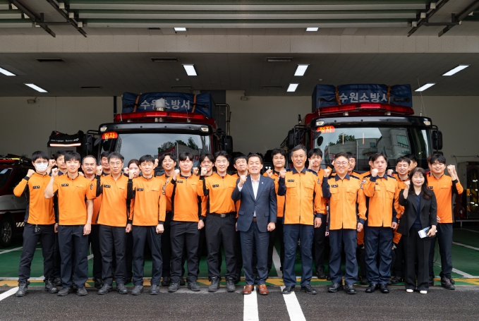 | ▲ 이재준 수원시장(가운데)가 수원소방서 근무자들을 격려한 후 함께하고 있다. |
