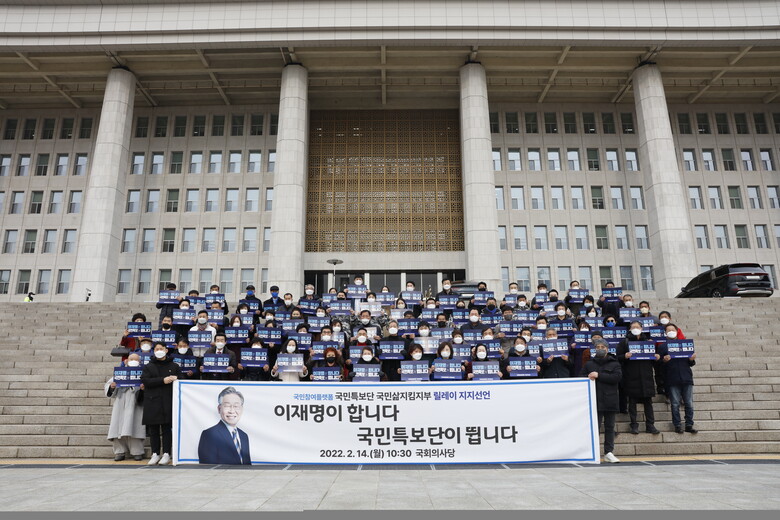 ▲더불어민주당 선대위 국민참여플랫폼 '국민특보단'이 14일 오전 여의도 국회의사당에서 이재명 후보를 지지하는 대규모 릴레이 지지선언을 하고 있다. [사진=국민참여플랫폼 국민특보단 대변인실] |