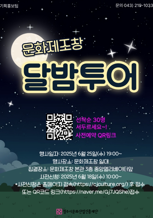 [무한뉴스=정민정 기자] 청주시문화산업진흥재단은 18일 오전 10시부터 ‘문화제조창 달밤투어’ 6월 투어객을 모집한다고 밝혔다.