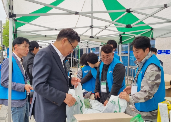 [무한뉴스=최진수 기자] 함양군소상공인엽합회는 4월 22일 함양읍 동문사거리 농협은행 앞에서 ‘만원의 기적 1+1 이웃돕기 바자회’를 열었다.