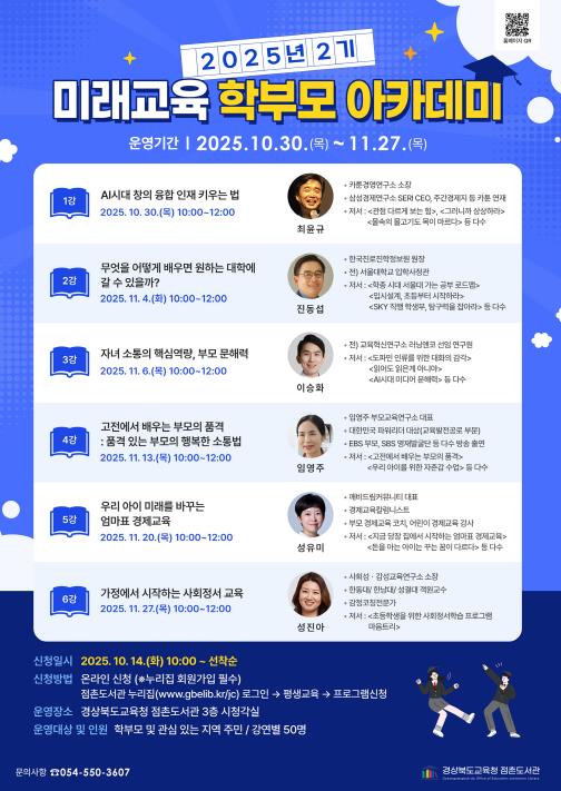 [무한뉴스=최진수 기자] 경상북도교육청 점촌도서관은 10월 30일부터 11월 27일까지 학부모 및 일반인을 대상으로 2025년 2기'미래교육 학부모 아카데미'를 운영한다.