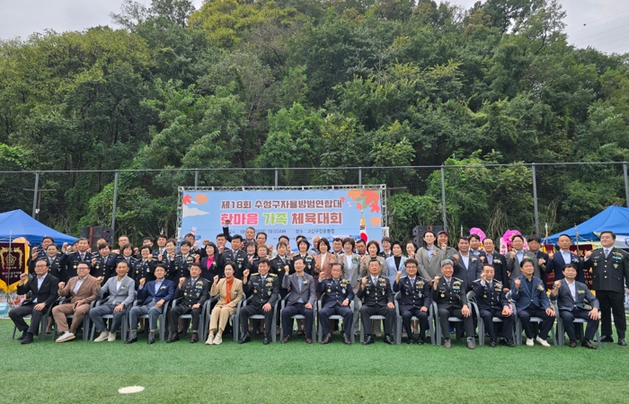 | ▲ 대구 수성구자율방범연합대가 가족 및 참석 내빈과 함께 ‘2025 수성구자율방범연합대 한마음 가족 체육대회’ 단체 기념촬영을 하고 있다. |