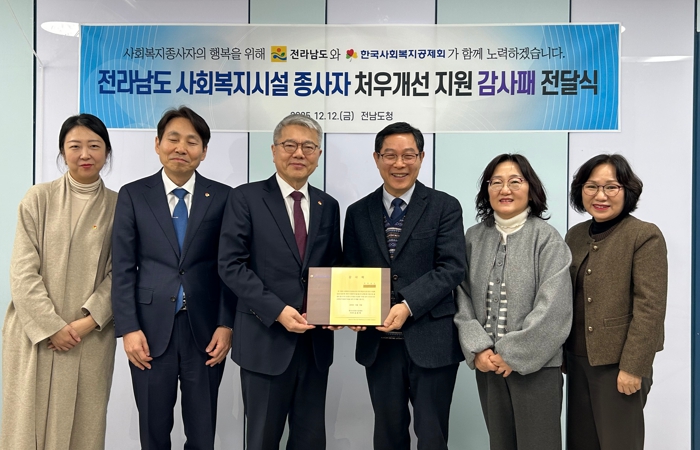 [무한뉴스=정민정 기자] 전라남도는 사회복지시설 종사자 처우개선에 기여한 공로를 인정받아 한국사회복지공제회로부터 감사패를 받았다고 밝혔다.