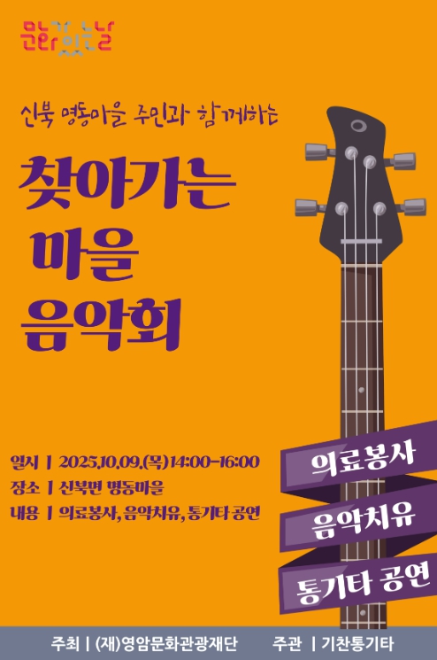 [무한뉴스=정민정 기자] (재)영암문화관광재단은 2025 문화가 있는 날 행사지원 사업으로 생활문화 동호회인 기찬통기타(대표:최문일)와 함께 신북 명동마을 주민을 대상으로 한 ‘찾아가는 마을 음악회’를 오는 10월 9일 한글날에 개최한다고 밝혔다.