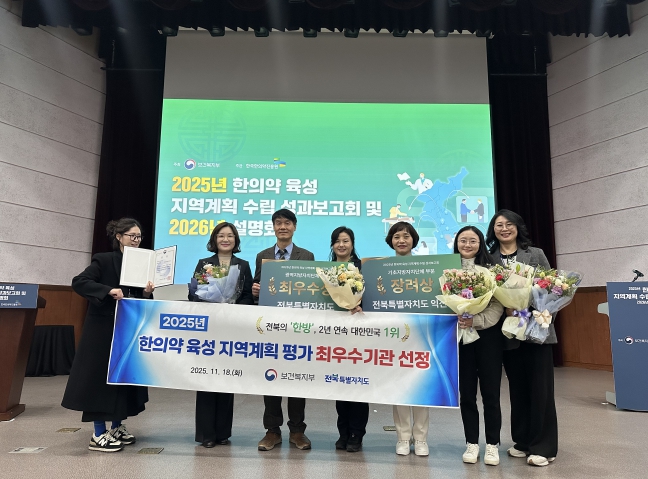 [무한뉴스=정민정 기자] 전북특별자치도가 18일 서울 SETEC 컨벤션센터에서 열린 보건복지부 주관 '2025년 한의약 육성 지역계획 수립 성과보고회'에서 2년 연속(‘24~’25) 최우수상을 수상했다고 밝혔다.