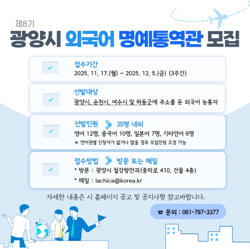 [무한뉴스=정민정 기자] 광양시가 국제교류 현장에서 활동할 ‘제8기 외국어 명예통역관’을 모집한다.