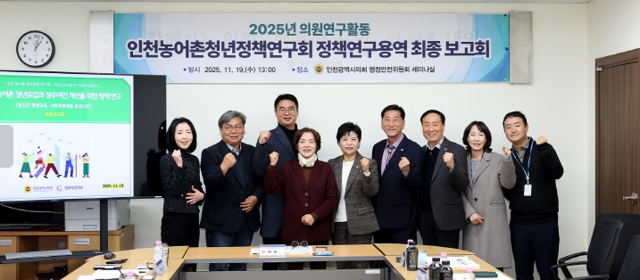 [무한뉴스=양현명 기자] 인천광역시의회 의원연구단체 ‘인천 농어촌 청년정책 연구회(대표의원 신영희)’가 19일 행정안전위원회 세미나실에서 정책연구용역 최종보고회를 열고, 농어촌·도서 지역의 인구 감소 대응을 위한 평생교육·사회적경제 기반 청년 정착 모델을 발표했다.