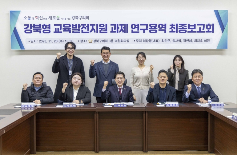 [무한뉴스=정승훈 기자] 강북구의회 의원연구단체인 ‘강북형 교육발전지원 연구회’ (대표의원 허광행)는 지난 11월 26일 의회 3층 의원회의실에서 최종보고회를 열었다.