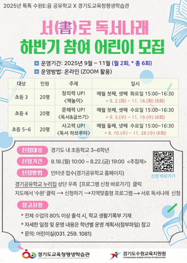 [무한뉴스=정승훈 기자] 경기도교육청평생학습관이 수원교육지원청과 함께 어린이 독서 습관 형성과 사고력 향상을 위하여 초등학교 3~6학년을 대상으로‘서(書)로 독서나래’를 운영한다.