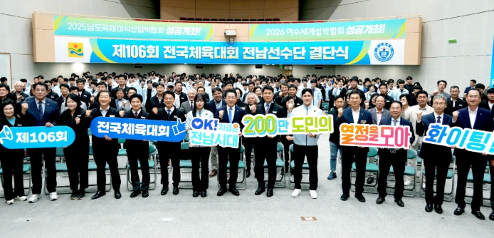 [무한뉴스=최진수 기자] 전라남도는 2일 도청 왕인실에서 제106회 전국체육대회 출전에 앞서 전남선수단의 선전을 다짐하는 결단식을 개최했다고 밝혔다.