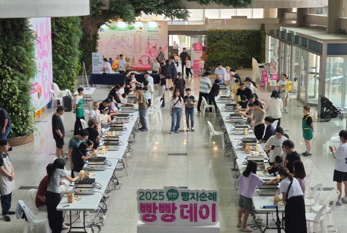 | ▲ 지난 14일 시민, 관광객들이 천안시청 로비에서 열린 ‘빵지순례 빵빵데이’ 호두과자 굽기 체험을 하고 있다. |