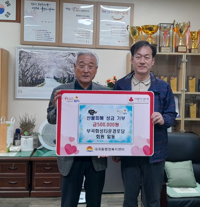 강진규 대곡동장은 “산불 피해 이재민의 아픔을 함께 나누기 위해 소중한 마음을 모아주신 경로당 회원들께 감사드린다. 조속한 일상 회복을 바라는 회원들의 마음이 이재민에게 큰 위로와 희망이 될 것이다.”라고 말했다.