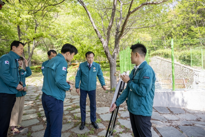 ▲ 박천동 북구청장이 28일 양정경로당 주변 상습침수 개선사업 완공 현장을 찾아 준공 상황을 점검했다. |