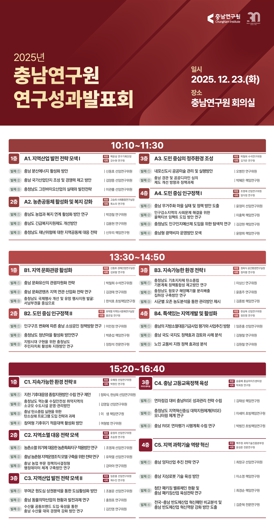 [무한뉴스=정민정 기자] 충남연구원은 오는 23일 오전 9시부터 연구원(공주 본원)에서 ‘2025년 연구성과발표회’를 개최하고, 올 한 해 동안 축적한 연구성과를 도 및 시·군 정책 수요자와 도민에게 공유하는 자리를 마련한다고 밝혔다.