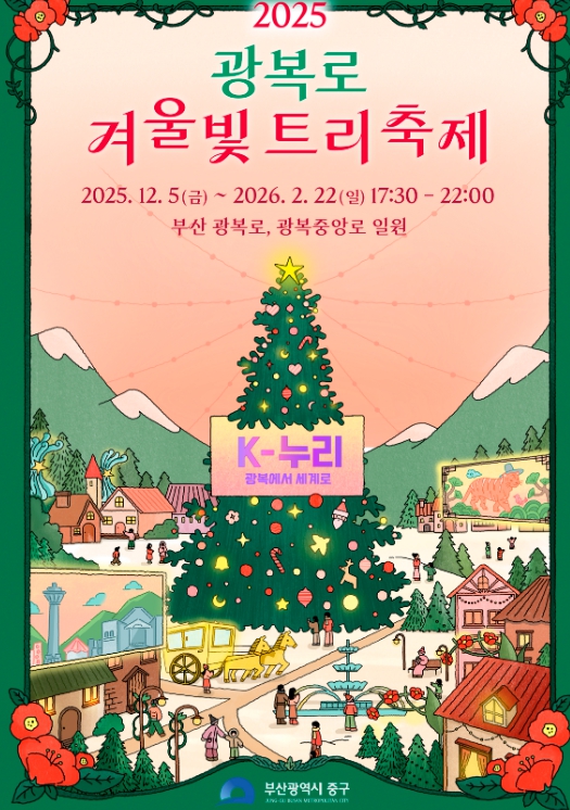[무한뉴스=최진수 기자] 부산 중구는 『2025 광복로 겨울빛 트리축제』를 2025년 12월 5일부터 내년 2월 22일까지 80일간 추진한다. 축제의 시작을 알리는 점등 개막식은 12월 5일 금요일 오후 5시 30분 광복로 시티스폿 메인트리 앞 특설무대에서 개최된다.