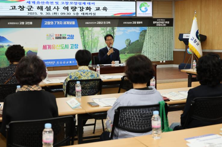 [무한뉴스=정민정 기자] 고창군이 30일 군청 5층 회의실에서 ‘2025 세계유산축전(10월2~22일)’과 ‘제52회 고창모양성제(10월29일~11월2일)’를 앞두고 해설사 친절교육을 실시했다.