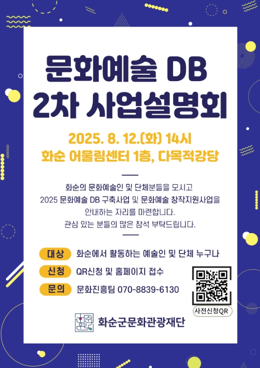 [무한뉴스=정민정 기자] (재)화순군문화관광재단은 8월 12일 오후 2시 화순 어울림센터 다목적강당에서 ‘2025 문화예술인 DB 구축 2차 사업설명회’를 개최한다고 밝혔다.
