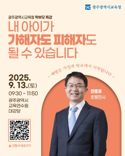 [무한뉴스=정민정 기자] 광주시교육청은 오는 9월 13일 오전 9시30분 광주시교육청연수원 대강당에서 학부모를 대상으로 천종호 부산지방법원 부장판사 초청 특강을 진행한다.