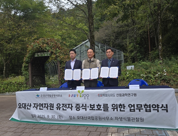 [무한뉴스=정민정 기자] 강원특별자치도 산림과학연구원은 9월 30일 국립공원공단 오대산국립공원사무소, 평창군과 우수 산림 유전자원 보존을 위한 업무협약을 체결하고, 오대산국립공원 내 보호수로 지정된 잎갈나무의 후계목을 육성하고 있다고 밝혔다.