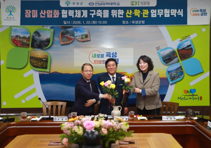 [무한뉴스=정민정 기자] 전남 곡성군은 장미산업화의 본격적인 추진을 위해 지난 20일 군청 소통마루에서 전남과학대학교, 주식회사 청화팜(대표 이화숙)과 함께 ‘곡성군 장미산업화 및 RISE 연계 산·학·관 협력체계 구축을 위한 업무협약’을 체결했다고 21일 밝혔다.