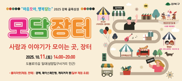 [무한뉴스=정승훈 기자] 서울 강북구는 오는 11일 오후 2시부터 8시까지 삼양입구사거리 인근 도봉로15길 일대에서 ‘2025 강북 골목상권 모담장터’를 개최한다고 밝혔다.