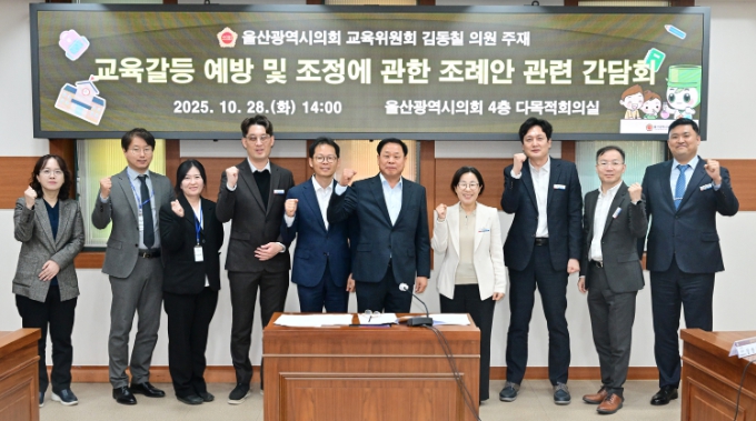 [무한뉴스=양현명 기자] 울산광역시의회 김동칠 의원(교육위원회, 달동ㆍ수암동)은 10월 28일 오후, 시의회 4층 다목적회의실에서 ‘교육갈등 예방 및 조정에 관한 조례안’ 제정을 위한 간담회를 열고 교육 현장에서 발생하는 갈등의 예방 및 조정체계 구축 방안에 대해 논의했다.