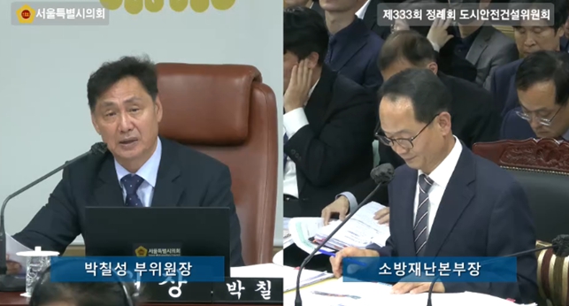 [무한뉴스=양현명 기자] 서울특별시의회 도시안전건설위원회에서 부위원장으로 의정활동 하고 있는 박칠성 시의원(더불어민주당, 구로4)은 지난 5일 열린 서울특별시의회 제333회 정례회 도시안전건설위원회 소관 소방재난본부 행정사무감사에서 화재안전 사각지대의 문제점을 지적하고 실효성 있는 대책 마련을 촉구했다.