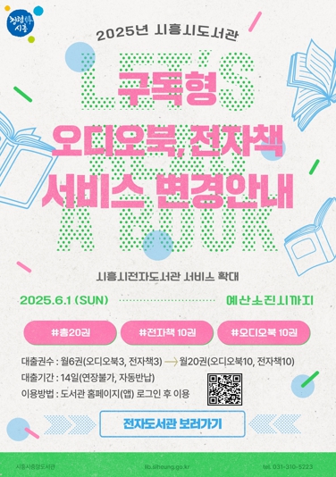 중앙도서관은 2025년부터 분기별로 한정된 인원을 선착순으로 접수하던 방식을 개편해 시흥시도서관 회원이면 누구나 별도의 신청 절차 없이 전자책과 오디오북을 자유롭게 이용하도록 개선했다. 나아가 6월부터는 기존 1인당 월 대출 가능 권수를 6권에서 20권(전자책 10권, 오디오북 10권)으로 확대 운영한다.