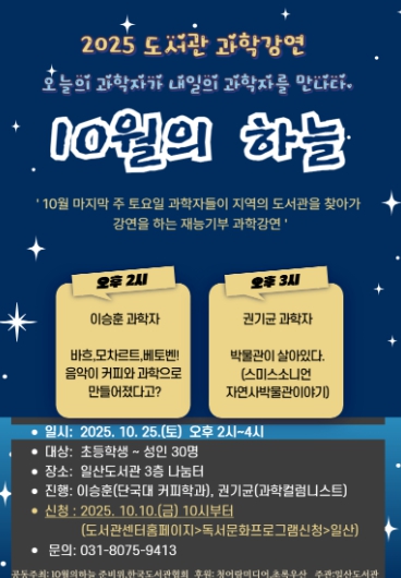 [무한뉴스=정승훈 기자] 고양특례시 일산도서관에서는 과학자들의 재능기부 도서관 과학 강연프로그램 ‘10월의 하늘’을 운영한다.