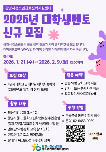 [무한뉴스=정승훈 기자] 광명시청소년재단 청소년진로진학지원센터는 관내 중·고등학교 청소년 대상 학과 멘토링 운영을 위해 ‘2026년 대학생 멘토단(wave)’을 모집한다고 밝혔다.