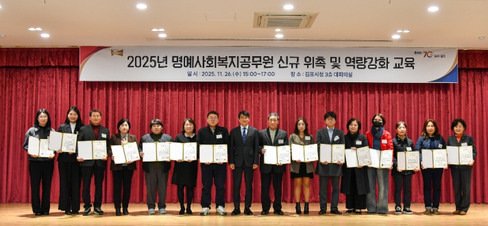 [무한뉴스=정승훈 기자] 김포시는 지난 26일 통·리장과 지역사회보장협의체 위원 등 지역 주민 181명을 신규 명예사회복지공무원으로 위촉했다. 이 중 대표 15명에게 위촉장을 수여했으며, 약 100명을 대상으로 역량 강화 교육도 함께 진행했다.