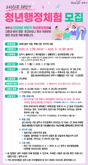 [무한뉴스=정승훈 기자] 양주시가 오는 6월 13일까지 ‘2025년 하반기 청년행정체험’ 참가자 26명을 모집한다고 밝혔다.