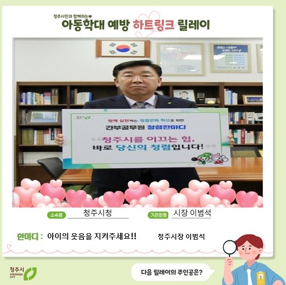 네 번째는 지난 4월 이범석 청주시장을 시작으로 지역사회 유관 기관이 참여하는 ‘아동학대 예방 하트링크 릴레이 홍보 캠페인’도 전개되고 있다.