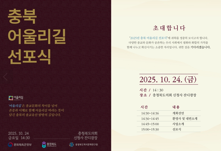 김영환 지사는 “오늘 선포식은 종교의 울타리를 넘어 새로운 화합의 길을 여는 뜻깊은 자리”라며, “어울리길이 앞으로도 도민의 일상 속에 자연스럽게 스며들고, 충북이 대한민국 종교 평화의 중심지로 우뚝 설 수 있도록 노력을 이어가겠다”고 밝혔다.