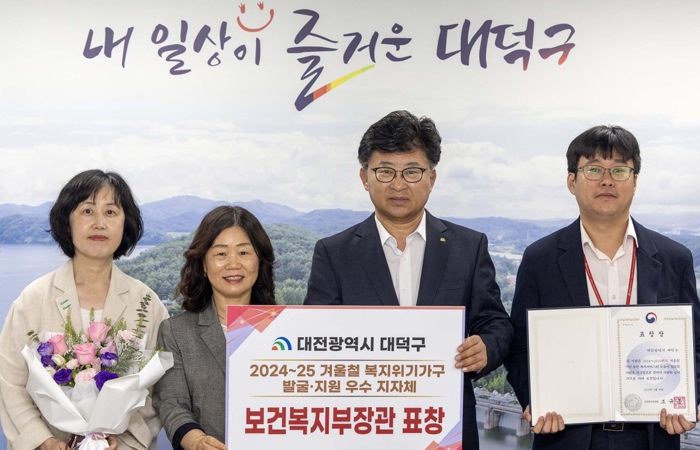 [무한뉴스=정민정 기자] 대전 대덕구는 ‘2024~25년 겨울철 복지위기가구 발굴·지원’ 분야에서 우수 지자체로 선정, 보건복지부 장관 표창을 수상했다고 2일 밝혔다.