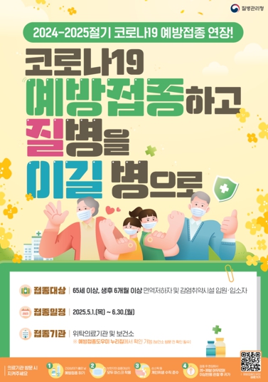 코로나19 예방접종 대상은 65세 이상 어르신, 생후 6개월 이상 면역저하자, 감염취약시설에 입원 또는 입소 중인 주민 등 고위험군이다.