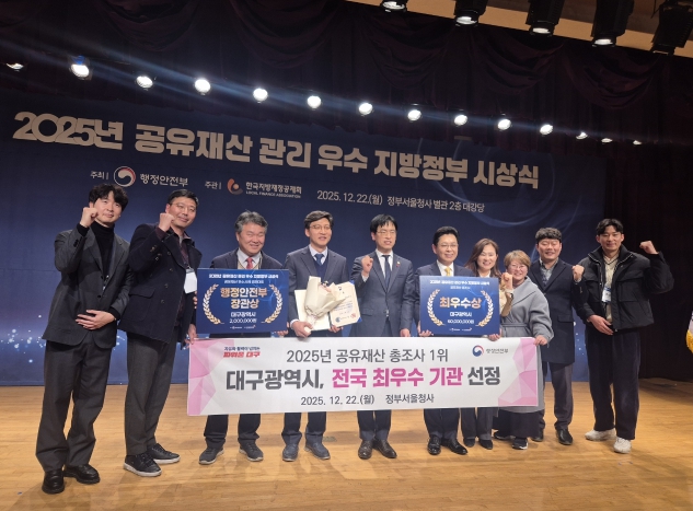 [무한뉴스=최진수 기자] 대구광역시는 12월 22일 행정안전부 주최 ‘2025년 공유재산 우수 지방자치단체 시상식’에서 공유재산 총조사 부문 최우수 기관 선정과 더불어, 공유재산 우수사례 경진대회에서 우수상(장관상)을 수상하는 등 공유재산 관리와 활용 분야에서 최고 수준의 역량을 입증했다.